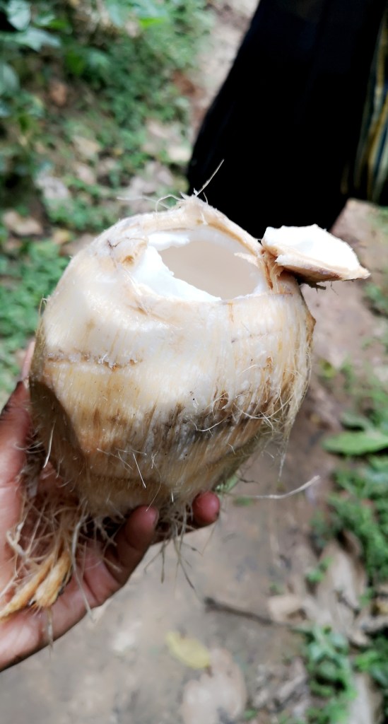 Sur le chemin du retour, on a croisé 3 jeunes garçons qui étaient partis récupérer des noix de coco, des cabosses de cacao et autres fruits dans la forêt. Comme on est gourmandes, on a pas pu résister à l’appel d’une bonne noix de coco fraîchement cueillie de l’arbre, on leur a donc demandé s’ils pouvaient nous en vendre une …